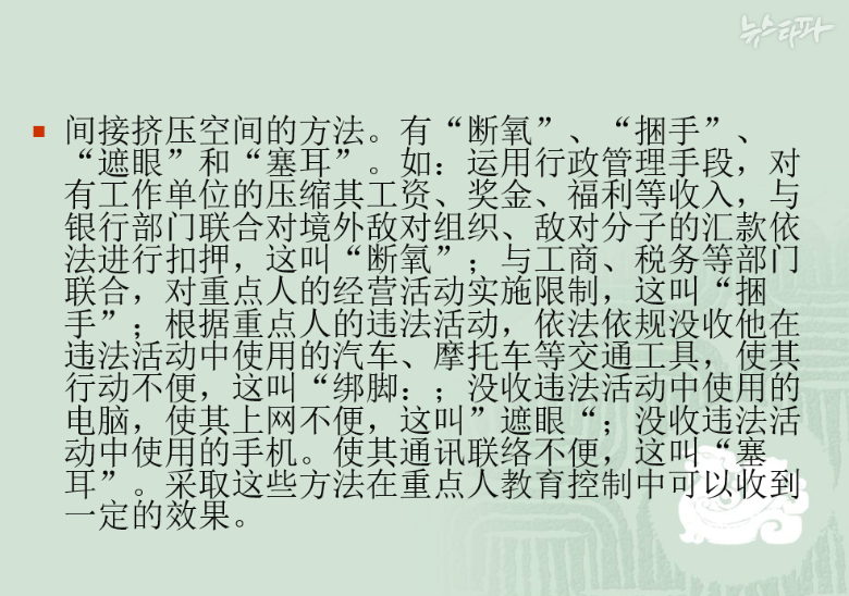 ▲아드리안 젠즈 미국 공산주의 희생자 기념재단 연구원이 입수한 신장 위구르 자치구 테케스현 2013년 국내안보 요원 교육용 PPT 자료. 탄압 대상자의 중국 내 은행 계좌 등 자산을 동결하도록 하는 조치, 이른바 '산소 차단' 전략 등 다양한 전략이 설명돼 있다. (출처: 아드리안 젠즈 미국 공산주의 희생자 기념재단 연구원)