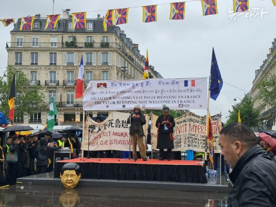 ▲지난해 5월 시진핑 주석의 프랑스 국빈방문 기간, 베이징 출신 장솅다 씨는 현지 중국 민주화 단체 '중국 자유 전선' 활동가들과 함께 중국 정부를 규탄하는 집회를 진행했다. (출처: 장솅다)
