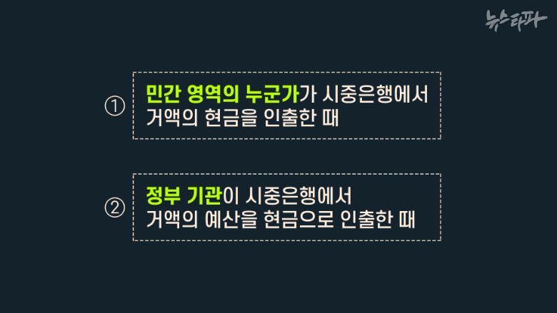 뉴스타파 취재 결과, 두 가지 가능성이 있다. ① 재력가나 대기업 고위 임원 같은 민간 영역의 누군가가 은행에서 거액의 현금을 인출했을 가능성, ②정부 기관이 은행에서 거액의 예산을 현금으로 인출했을 가능성. 관봉이 은행 밖으로 나올 수 있는 가능성은 이렇게 두 가지 경우의 수로 압축된다.