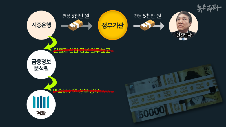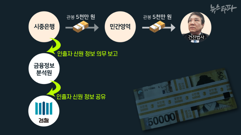 ▲민간인이 은행에서 관봉 5천만 원을 찾아 건진법사에게 건넸다면, ▲'특정금융정보법'에 따라 은행이 인출자의 정보를 금융정보분석원에 의무적으로 보고해야 한다.