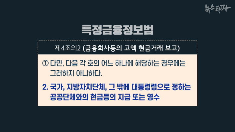 '특정금융정보법 4조의2 1항'에서는 누군가가 은행에서 하루에 1천만 원 이상, 거액의 현금을 찾아가도 은행이 금융정보분석원에 인출자의 정보를 보고하지 않아도 되는 예외를 규정하고 있다. 그 중 하나가 국가, 지방자치단체, 공공단체가 인출한 현금이다.