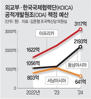 이날 김준형 조국혁신당 의원실이 외교부로부터 제출받은 ‘ODA 사업 자료’에 따르면, 2023년 아프리카 대륙 관련 ODA 예산은 약 2257억1300만 원으로 2022년(1622억 원)보다 635억 원 늘어났다. 동남아시아는 92억 원, 서남아시아는 266억 원이 늘어난 것과 비교해 증액 폭이 훨씬 크다.