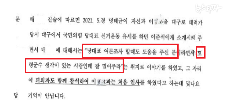 이준석 후보와 배 씨가 수차례 만난 사실은 검찰 수사기록에서도 확인된다. 김태열 전 미래한국연구소장은 두 사람이 2021년 5월에만 두 차례 만난 사실이 있다고 진술했다.