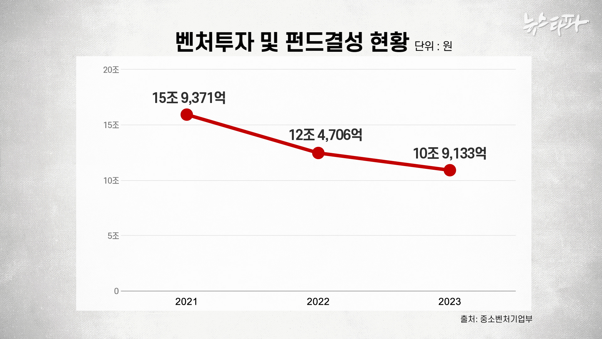 윤석열 정부 집권 2년차를 맞았던 2023년은 고금리와 유동성 저하로 벤처 업계에는 가혹한 시간이었다. 코로나19에 따른 재정 공급 확대로 시장에 넘쳐났던 유동자금이 다른 투자처를 찾으면서 확연히 줄고 있었기 때문이다. 중소벤처기업부에 따르면 2021년 15조 9천억 원에 달했던 우리나라 벤처투자금액은 2023년 10조 9천억 원으로 크게 줄었다.