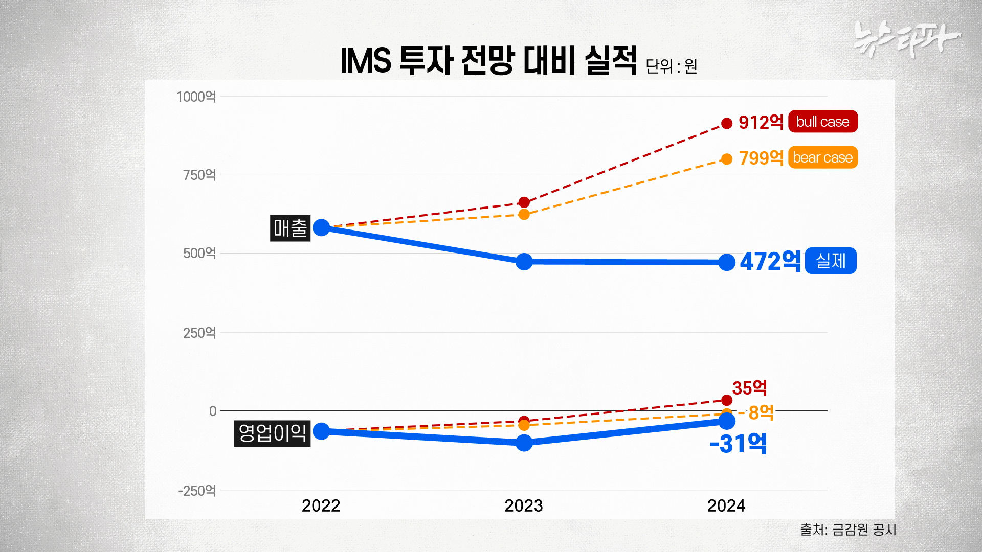 2022~2024년 IMS의 투자 전망 대비 실적. 최악의 시나리오(Bear Cas)보다도 하향된 경영 실적을 거뒀다.