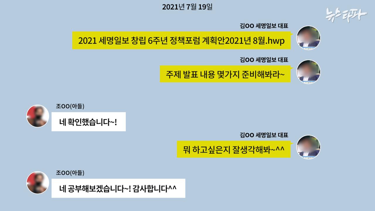 ▲아들 조OO씨는 대학생위원장에 선출되기 전 이준석 토크콘서트 행사를 준비하는 등 접점을 늘리기 위한 노력을 했다. 당시 행사를 주관한 세명일보 김 모 대표와 아들 조 씨가 나눈 카카오톡 재구성 / 2021.7.19.