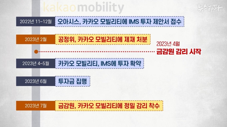 카카오모빌리티가 김건희 최측근이 지분을 보유하고 있던 IMS에 투자를 결정한 건 바로 이 시기였다. 오아시스 펀드가 IMS에 대한 투자 제안서를 카카오모빌리티에 보낸 건 2022년 11월에서 12월 경, 카카오모빌리티가 투자를 확약한 건 2023년 4월에서 5월 사이다. 그리고 실제 투자금 집행은 6월 말에 이루어졌다. 카카오모빌리티가 공정위 처분을 받고, 카카오 본사가 주가조작 혐의로 의심받고, 카카오모빌리티의 재무제표에 대한 금감원 심사가 이루어지는 시기 한 가운데에 투자 결정이 이루어진 것이다. 투자금액은 30억 원, 전체 펀드 201억 원 (그 중 184억이 IMS에 투자됐다.) 중 15%에 해당하는 규모다.