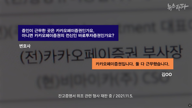 특히 김 씨는 잔고 증명서 위조 사건으로 재판을 받던 법정에서도 자신이 카카오페이증권의 임원으로 근무했던 경력이 있다고 증언했다. 2021년 11월 5일, 잔고 증명서 위조 관련 사건 재판에 출석한 김 씨는 카카오페이 증권에서 근무한 게 맞는지를 묻는 변호사의 질문에 대해 카카오페이 증권에서 근무했던 게 맞다고 답했다.