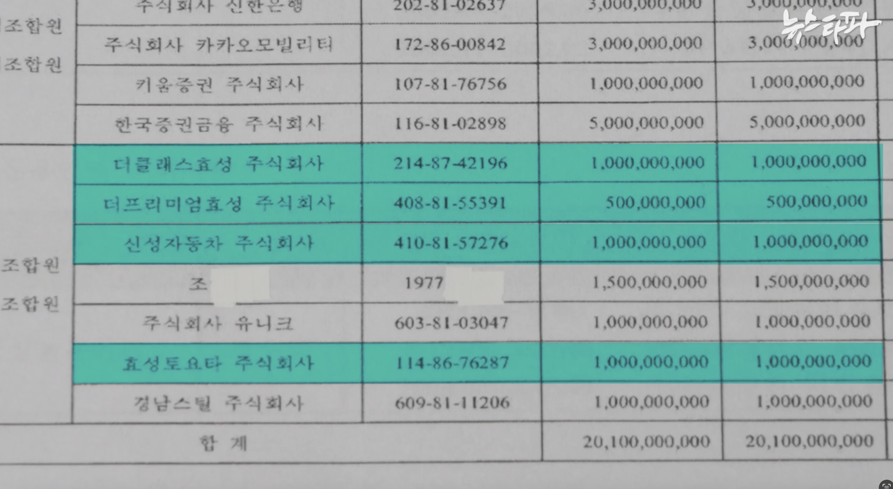 김건희 측근이 지분을 갖고 있던 벤처기업 IMS가 유치한 의문의 184억 투자, 여기에는 투자 당시 효성의 계열사들이 여러 곳 등장한다. 뉴스타파가 입수한 오아시스 투자조합의 조합원 규약에 따르면 더 클래스 효성이 10억 원, 더 프리미엄 효성이 5억 원, 신성자동차가 10억 원, 효성 도요타가 10억 원을 투자했다.