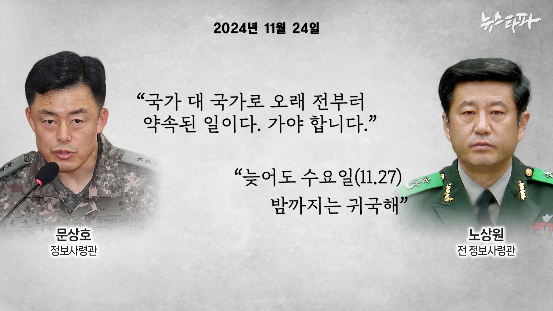 12.3 비상계엄의 기획자로 꼽히는 노상원 전 정보사령관이 지난해 11월 말, 당시 해외 출장 중이던 문상호 정보사령관에게 북한의 오물풍선 도발 하루 전 날을 콕 집어 조기 귀국을 종용했던 것으로 확인됐다. 뉴스타파는 이 같은 내용이 담긴 노상원-문상호 간 통화 내용을 문상호 전 사령관의 검찰 진술을 통해 확인했다.