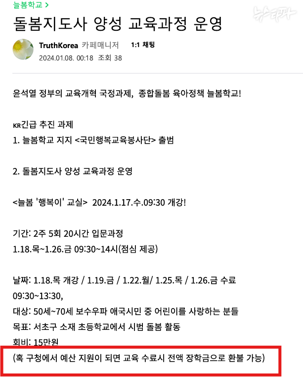트루스코리아 대표 정 씨는 해당 카페에 '리박스쿨에서 늘봄학교 프로그램 강사 등을 모집한다'는 글도 올렸는데, 이 모집글에서 리박스쿨 측이 구청 등 지방자치단체의 예산 지원을 시도한 흔적이 포착됐다.