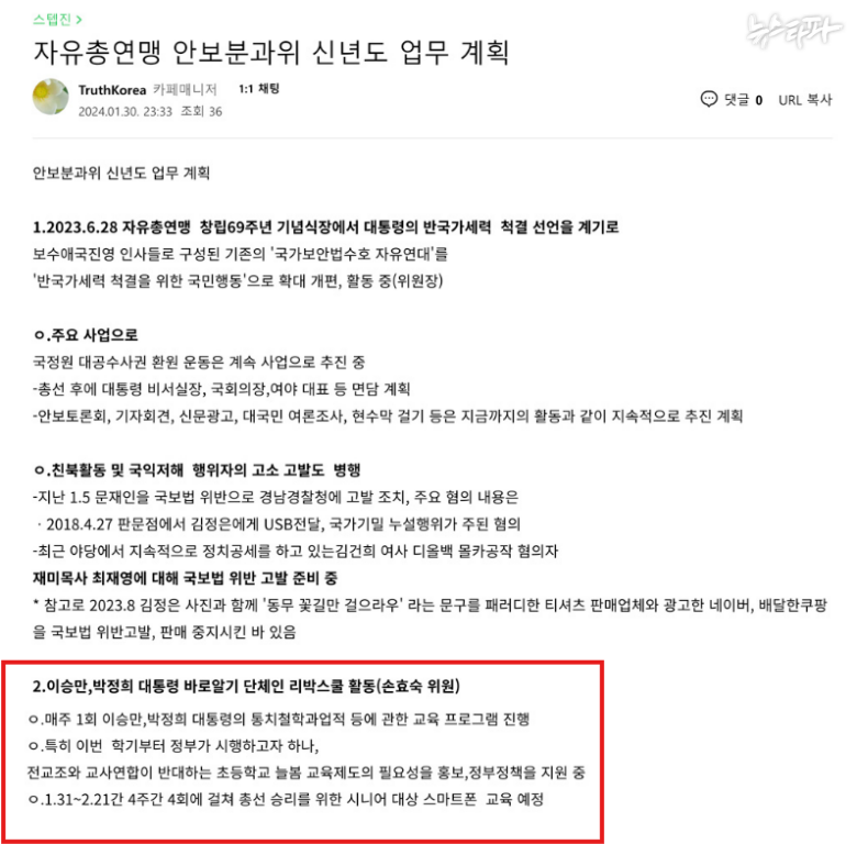 뉴스타파는 리박스쿨과 댓글공작팀 '자손군'을 함께 운영한 단체 '트루스코리아'의 대표 정 모 씨가 운영한 네이버 카페 내용을 확인했다. 'Truthkorea'라는 아이디를 사용하고 있는 정 씨는 2024년 1월 30일 네이버카페에 '자유총연맹 안보분과위 신년도 업무 계획'이라는 글을 올렸다.