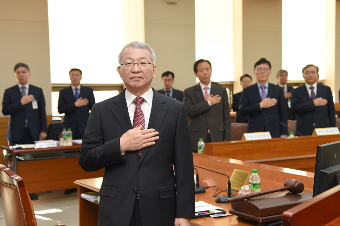 2016년 12월 2일 전국 법원장 회의에서 양승태 전 대법원장과 전국 법원장들이 국민의례를 하고 있다. 이날 법원행정처는 재판 공정성 확보를 위한 사법행정 개선 방안을 발표했다. (출처: 대법원)