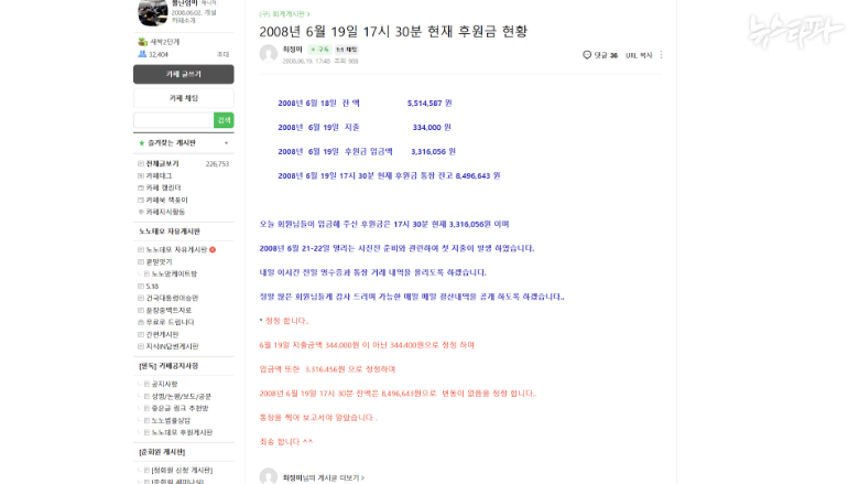 2008년 6월 19일, 최 씨가 노노데모 네이버 카페에 후원금 현황을 보고한 게시물.