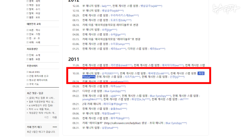 레이디블루 네이버 카페 운영진에 최정미(sisa*****)의 이름과 아이디가 확인된다. (출처: 네이버 카페 레이디블루)