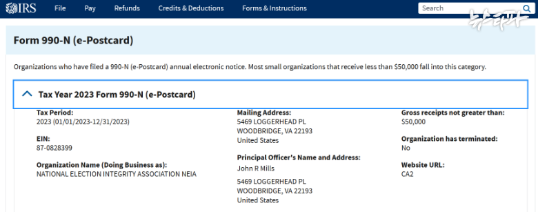 미국 국세청 홈페이지에서 확인한 '국가선거투명성협회' 정보