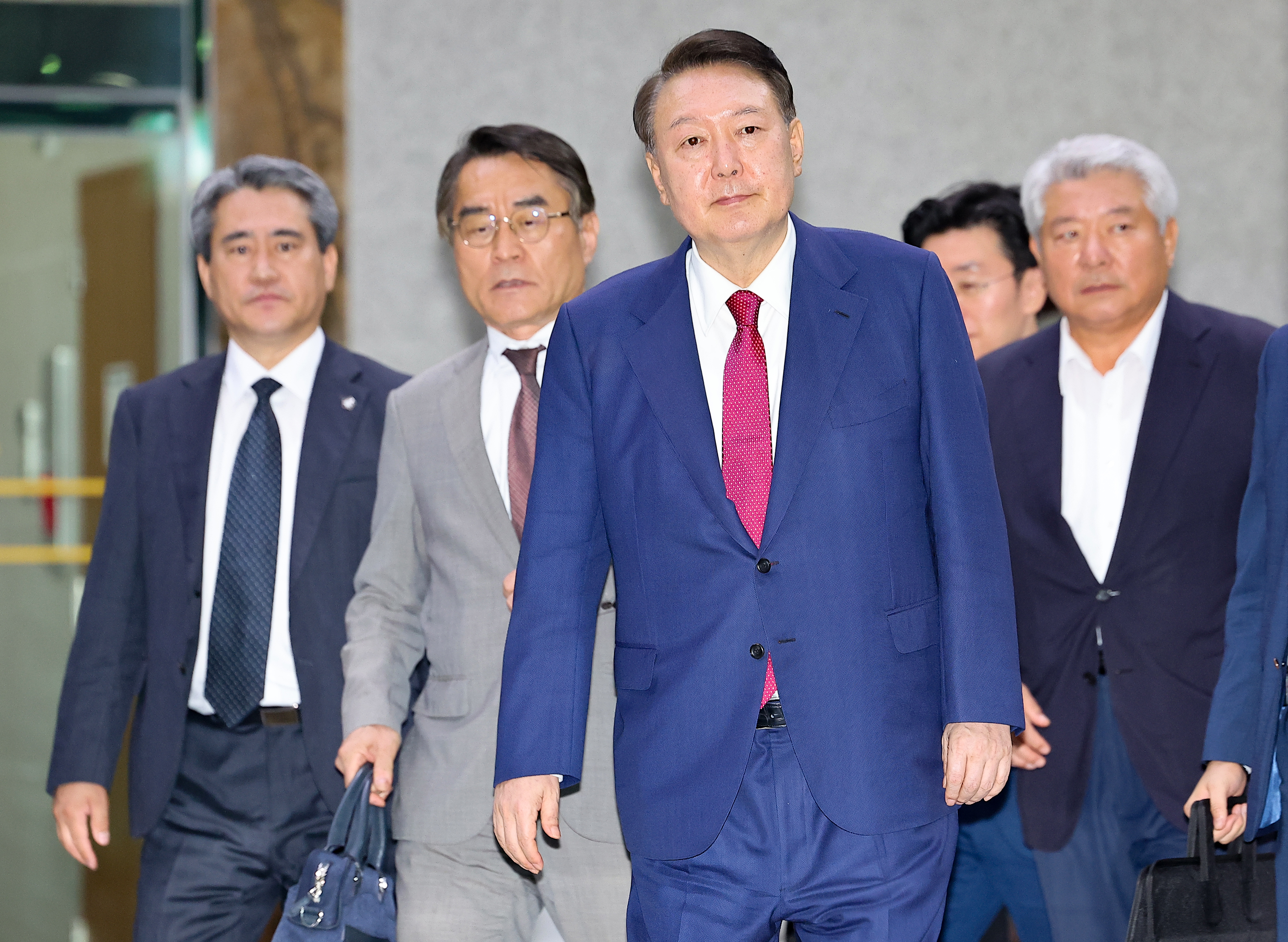 5일 내란 특검 2차 조사를 마치고 나온 윤석열(중앙)과 윤석열의 변호인들.