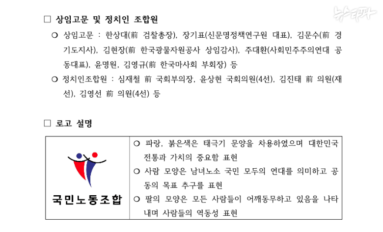 2020년 출범한 국민노조 내부 문건에는 정치인 10여 명이 등장한다. 김문수 전 경사노위원장은 상임고문을 맡았다. '정치인 조합원'에는 현직 의원들도 포함됐다.