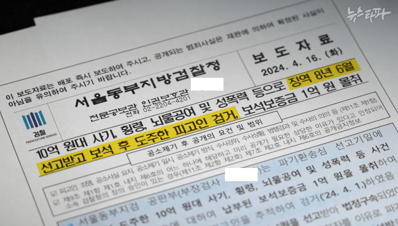 2024년 4월 16일 서울동부지검에서 낸 보도자료다. 제목은 “징역 8년 6월 선고받고 보석 후 도주한 피고인 검거”. 내용을 보면 “파기환송심 선고기일에 불출석・도주한 10억 원대 사기, 횡령, 뇌물공여 및 성폭력 등 사건 피고인을 추적하여 2024년 4월 1일 검거하였다”고 돼 있다.