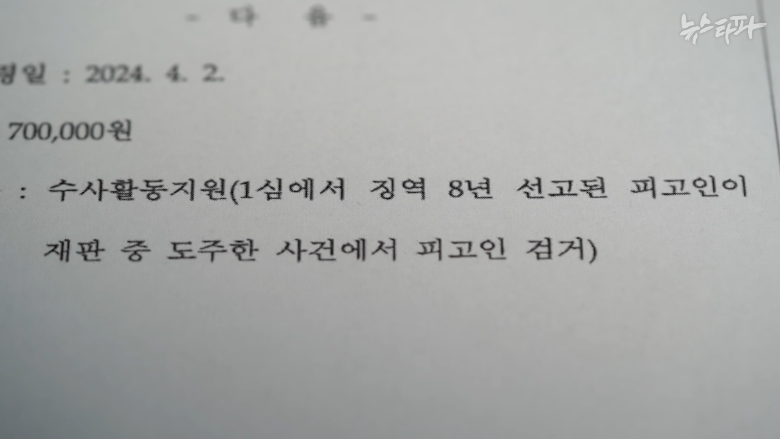 검거 바로 다음날인 2024년 4월 2일. 서울동부지검의 한 검찰 공무원이 특수활동비 70만 원을 전액 현금으로 가져갔다. 사유는 1심에서 ‘징역 8년 선고된 피고인이 재판 중 도주한 사건에서 피고인 검거’. 특수활동비를 특수활동이 아닌 포상금에 쓰인 걸로 보인다.