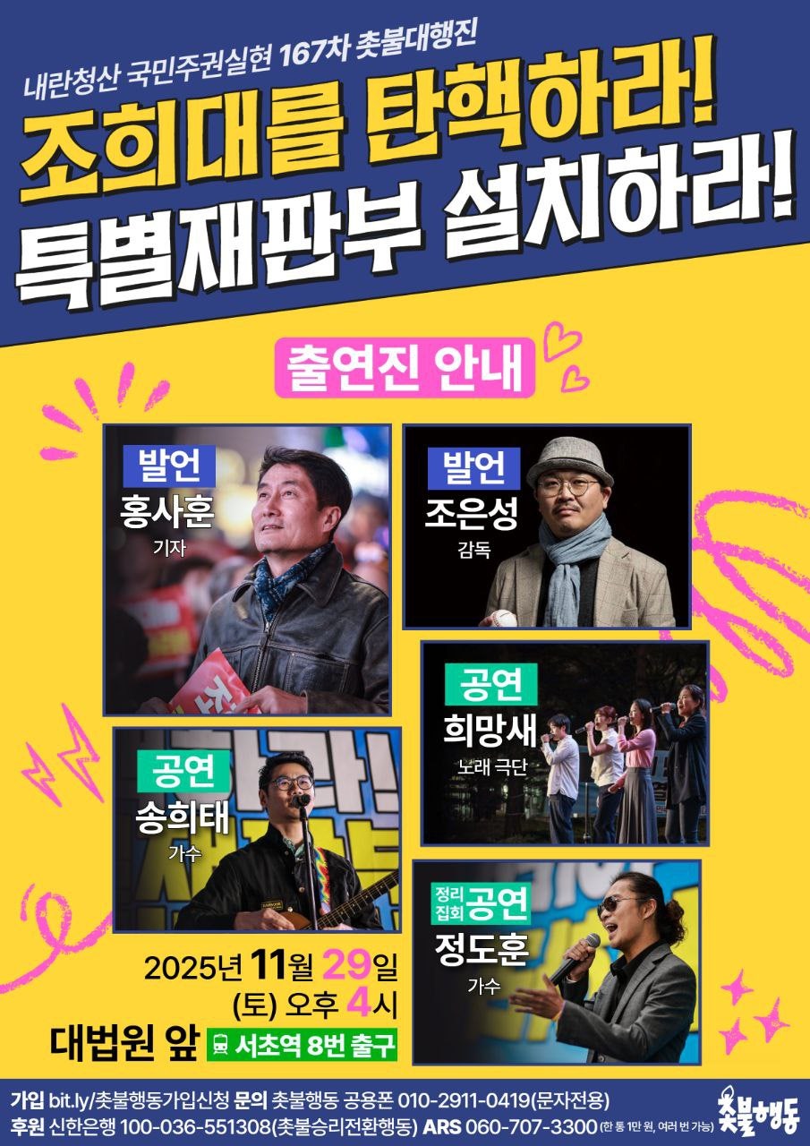 11월29일(토) 4시 대법원 앞 서초역 내란청산 167차 촛불대행진 집회 일정